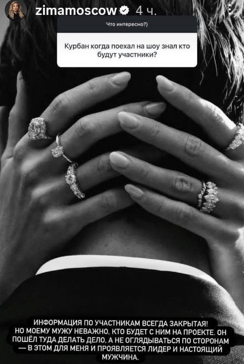 - Супруга Курбана Омарова гордится тем, что Курбан идёт вперед и не боится конкуренции. Это намёк на то, что муж Ксении Бородиной не стал участвовать в съемках, когда узнал, что его коллегой будет Курбан?