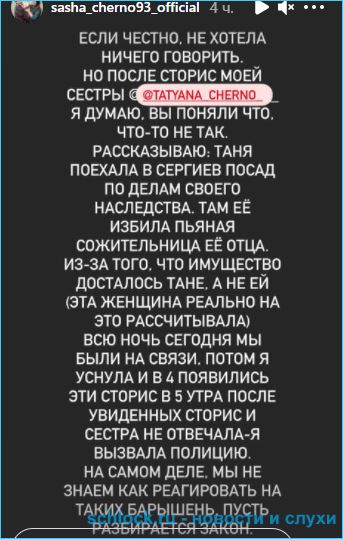 - Александра Черно рассказала про несчастье, случившееся в её семье. Младшая сестра Саши Татьяна отправилась доой в Сергиев Посад и в квартире обнаружила отца. Сожительница мужчины набросилась на девушку и нанесла ей травму.