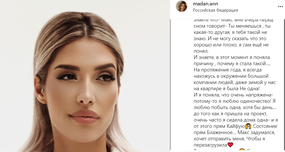 - Анна Мадан поняла, почему она в последнее время агрессивная и всем недовольна. Девушка устала от большого количества людей и вынуждена побыть в одиночестве, чтобы восстановить жизненную энергию. Аня намекнула, что Максим Моргенштерн отправляет её в отпуск, а сам остается на Поляне.