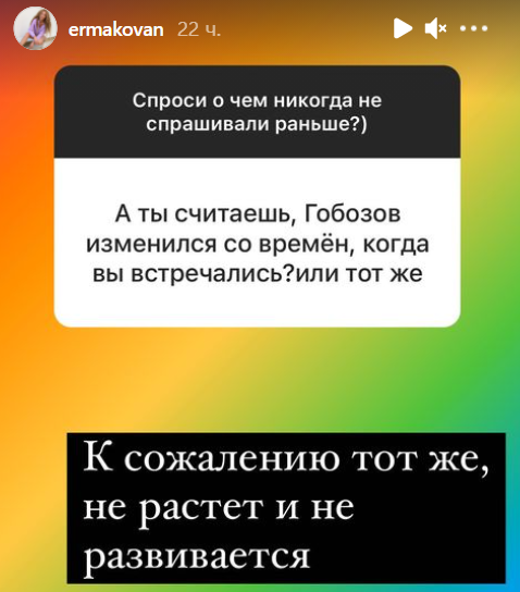 - Надежда Ермакова считает, что Александр Гобозов не поменялся с тех пор, как они встречались, мужчина не растет и не развивается. Возможно, он достиг своего максимума и, в отличие от Нади, смог найти на проекте девушку. На данный момент Гобозов отдыхает с Марией Давидовой в Геленджике, а Ермакову отверг как женщину Борис Карпов.