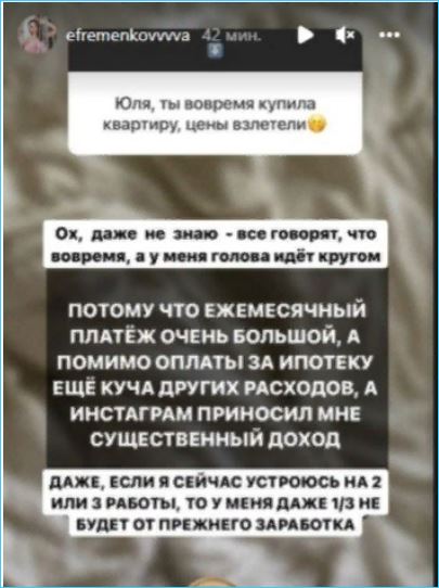 - Юлия Ефременкова уже сожалеет, что купила квартиру в ипотеку, так как платеж большой, а заработок в Инстаграм накрылся. Еще и Мондезир вернулся, который не смог ужиться на поляне Дома 2.