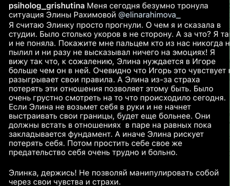 - Элина Рахимова не в состоянии выстроить здоровые отношения с Игорем Григорьевым, потому что они находятся на разных этапах эмоционального развития. Точка!