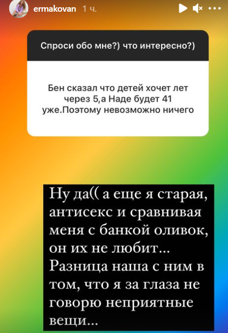 - Надежда Ермакова обижена на Бориса Карпова, который у неё за спиной свободно говорит о том, что Надя скоро выйдет из детородного возраста, а ему нужна в будущем молодая жена, чтобы создать полноценную семью и растить детей. Карпов признался под камерами, что не хочет ничего начинать с Ермаковой, потому что она его не привлекает как женщина, чем вызвал у неё недоумение, ведь спокойно мог обо всем сказать в глаза.