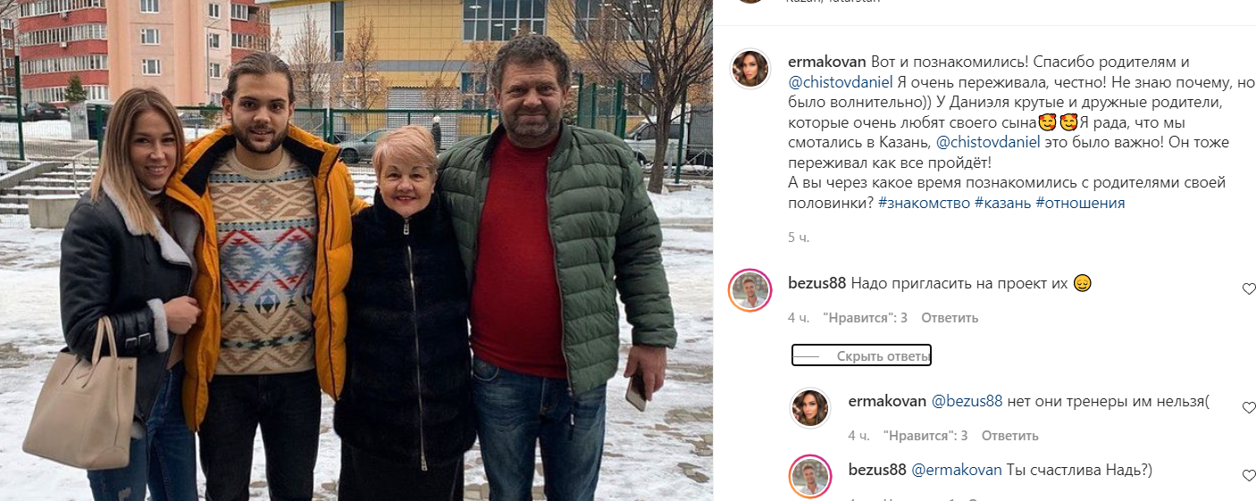 - Надежда Ермакова после знакомства с родителями Даниэля Чистова опубликовала довольно скромный пост, без её любимых восторженных фраз, эпитетов, похвалы и стихов, без приукрашивания ситуации и особых комплиментов. То ли Ермакова боится вызвать недовольство родителей Даниэля, то ли итоги встречи с "крутыми и дружными" родителями ей не понравились?
