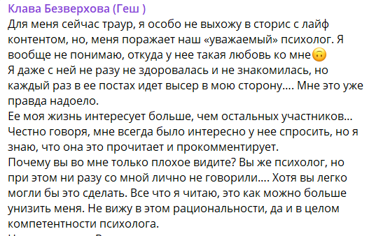 - Клавдия Безверхова возмущена предвзятым отношением к ней со стороны психолога Дома 2 Светланы Прель. Клаве кажется, что психолог её недолюбливает и провоцирует публичные разборки, хотя могла бы подойти и поговорить лично, приехав на Поляну реалити-шоу.