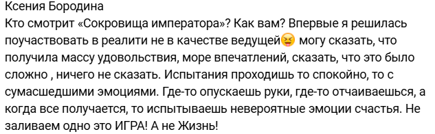 - Ксения Бородина прокомментировала своё участие в шоу "Сокровища императора". Телезрители заметили, что Николай Сердюков ведёт себя по-хамски с женщинами и остались недовольны этой парой участников, хотя им удалось пройти испытания в 8-й серии шоу и перейти на следующий этап. Ожидаются новые разборки телеведущей с подписчиками?