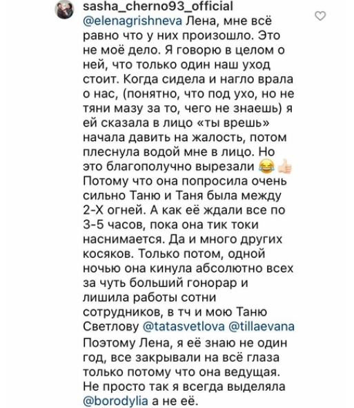 - Саша Черно поддержала Кадони и в комментариях на своей странице, которые позже решила удалить, рассказала о том, почему считает Ольгу Бузову худшей ведущей Дома 2. Если верить бывшей звезде телепроекта, Ольга постоянно задерживала съемки, подвела продюсера ББ Шоу Татьяну Светлову и пыталась очернить семью Оганесян. Так как у Бузовой нет привычки оправдываться, то никто уже не узнает правду?