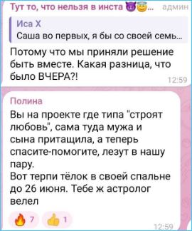 - Выяснились подробности драки Александры Черно с Анастасией Осиповой, которую Саша приревновала к мужу Иосифу Оганесяну. Настя теперь ждет помощи от друзей из Химок, ведь Черно поддержали участники на поляне.