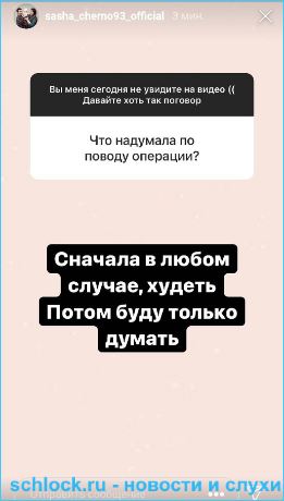 - Александра Черно рассказала, что не только сама подцепила простуду, но и Стефан заболел. Саша считает, что растет число её подписчиков, ведь она воспринимает жизнь в социальных сетях как работу. Думает жена Иосифа Оганесяна и о пластических операциях, но, только после того, как похудеет.