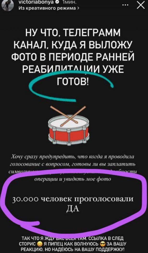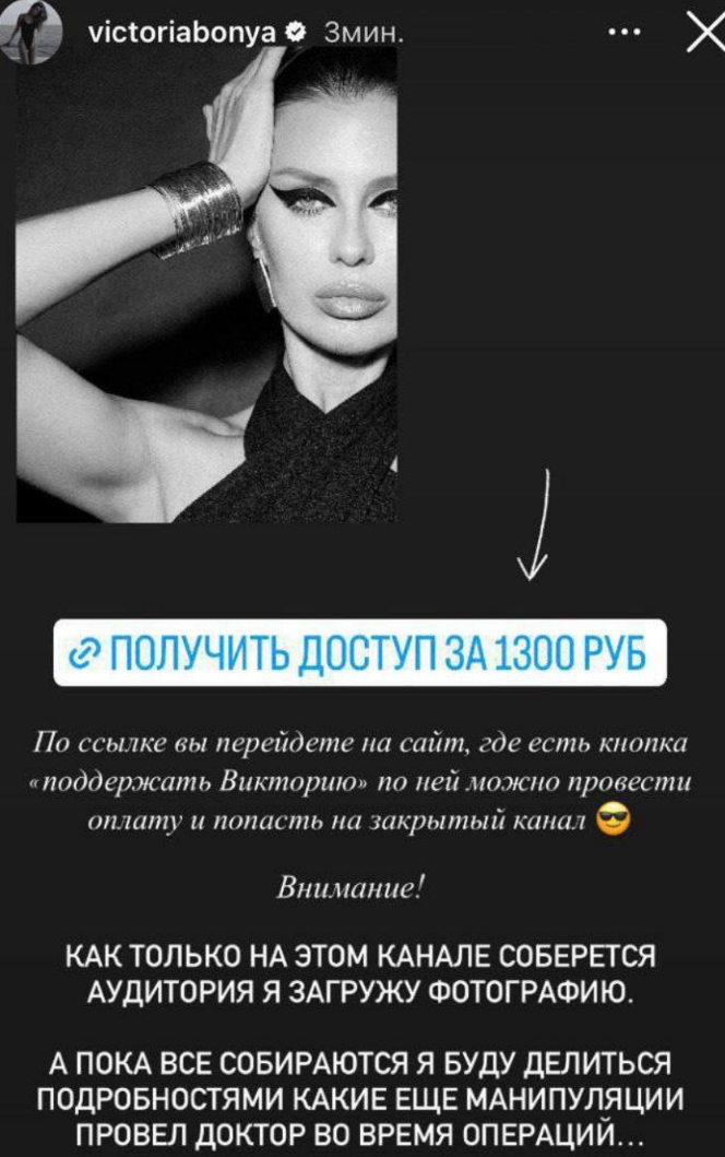 Стало известно, что снимки Виктории Боня после пластики попали в интернет, хотя бывшая участница реалити-шоу Дом 2 тщательно скрывала внешность под кепкой и солнцезащитными очками. Виктория организовала сбор денег в свою поддержку, начала продавать за 1300 рублей ссылку на закрытый телеграм-канал, ждала, пока наберется 30 тысяч подписчиков, жаждущих увидеть её фотографии, в итоге, многие телезрители знают результат. Прощай, афера?