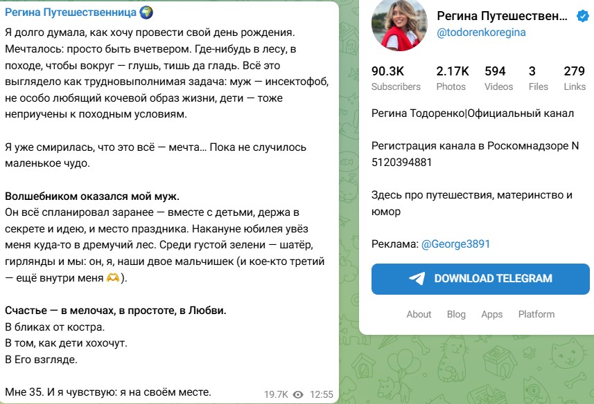 О том, что она находится в "интересном" положении, рассказала своим подписчикам сама Регина. Регина Тодоренко раскрыла третью беременность в социальных сетях, делясь с поклонниками новостями в день своего рождения. "Я долго думала, как хочу провести свой день рождения. Мечталось: просто быть вчетвером. Где-нибудь в лесу, в походе, чтобы вокруг — глушь, тишь да гладь. Всё это выглядело как трудновыполнимая задача: муж — инсектофоб, не особо любящий кочевой образ жизни, дети — тоже неприучены к походным условиям(орфография и пунктуация автора сейчас и далее сохранены)", - начала она своё повествование. "Я уже смирилась, что это всё — мечта… Пока не случилось маленькое чудо. Волшебником оказался мой муж. Он всё спланировал заранее — вместе с детьми, держа в секрете и идею, и место праздника. Накануне юбилея увёз меня куда-то в дремучий лес.", - продолжила она.