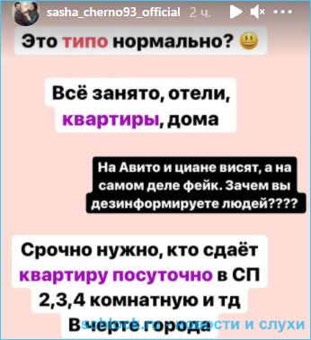 Родной Сергиев Посад не принимает Сашу Черно, рано ей ещё возвращаться, Москву не покорила, значит, пусть барахтается там, где она барахтается. В "очке", как говорит Марина Африкантова. Самое забавное, что Саня предъявляет претензии своим подписчикам, которые не подсуетились и не нашли ей квартиру. "Срочно надо! Скоро выезжаем!", угрожающим тоном пишет Черно, а в ответ тишина.
