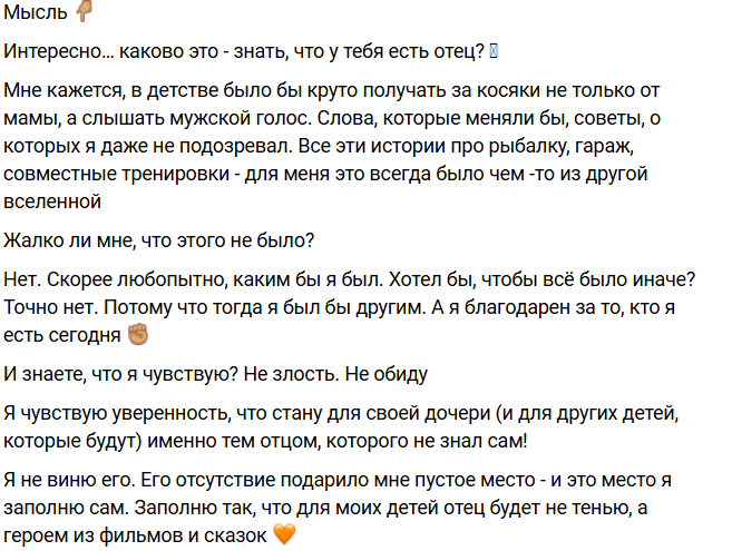 Бывший участник телепроекта Дом 2 вспомнил, как он рос без отца и не видел мужского воспитания - рыбалки, походов, мужских советов. Эта тема до сих пор не отпускает блогера и он иногда размышляет, каким бы вырос с отцовской поддержкой.