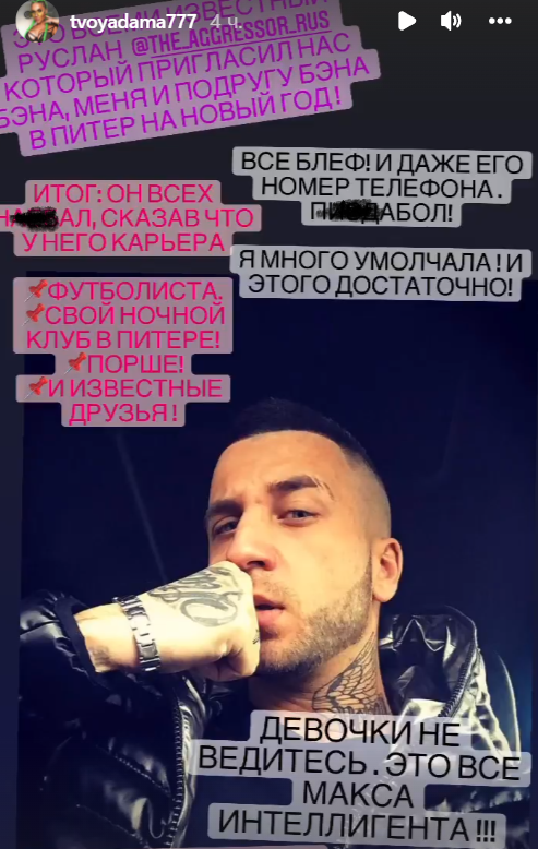 Бывшая участница проекта, отличившаяся на Доме 2 скандальным поведением, утверждает, что Руслан употребляет запрещенные вещества и лжёт, что у него есть деньги, дорогой автомобиль и квартира.