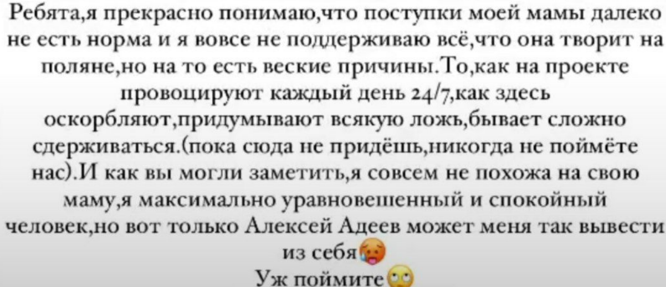 Самонина утверждает, что не похожа на маму, но обе дерутся с Адеевым, так как на проекте нет мужчин, способных успокоить проснувшегося в Лёше провокатора. Маме Ани этого провокатора не удалось усыпить даже сковородкой, утварь была сломана, а провокатор всё не слышал настойчивое "Спокойной ночи", летящее из уст Татьяны Самониной вперемешку с отборным матом. Посмотрим на шлоке на эту свару в ночном эфире дом 2 26.06.2023 через неделю.