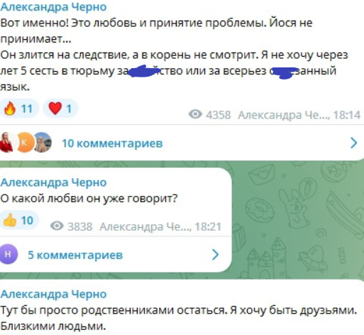Черно вопит, что муж нарушил её личные границы, они давно уже чужие друг другу люди, даже друзьями после развода навряд ли останутся. И наговаривала на Иосифа Саша сегодня целый день, в конце которого призналась, что ей спустя 12 лет написал сообщение бывший парень. Не потому ли она уехала в Посад без семьи?