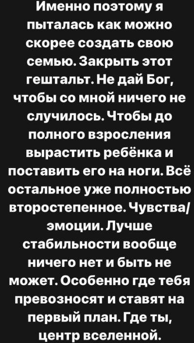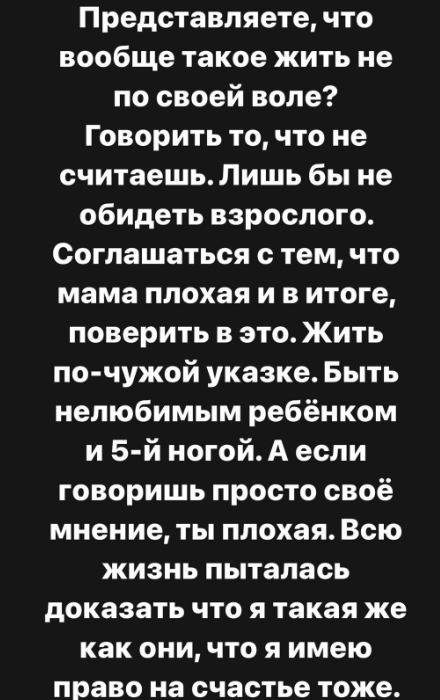Александра Черно много лет назад уехала из Мишутино, а детские обиды до сих пор мешают ей жить спокойно и, по словам экс-участницы Дома 2, стали причиной появления комплексов и желания сохранить семью, какой бы странной она ни была. Александра перечислила все неприятности прошлого, которые её тревожат, и призналась, что хочет стать центром Вселенной в своей семье, потому и приходится ссориться с домочадцами. Саша Черно нашла виновника своих бед - бабушку, и утверждает, что в детстве её специально лишили общения с мамой.
