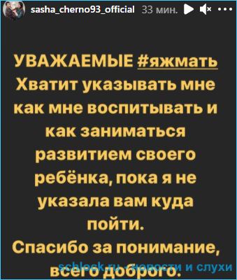 Стоило только Александре Черно рассказать подписчикам про посещение детской поликлиники с сыном Стефаном, который испугался врача и полчаса кричал, по словам мамы, как ей начали писать более опытные женщины, желающие дать бесплатный совет по воспитанию и уходу за ребенком. Саша Черно отбивается в интернете от нападок "яжматерей". Сначала женщины Саше писали, что она редко показывает ребенка, а когда бывшая участница дома 2 начала выставлять Стефана в сторис - сразу же стала невнимательной мамой.