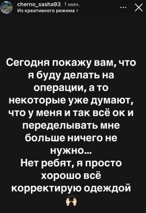 Два дня Черно боролась с паническими атаками, а вчера после обследования и УЗИ узнала о наличии кистозных образований в области молочной железы. Вполне возможно, что маммопластику ей сделают еще не скоро. Подробнее о планах Чернявской мы рассказывали на шлоке здесь.