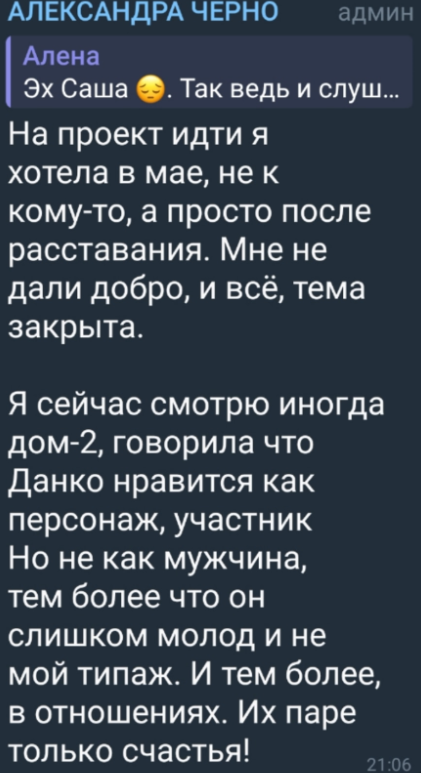 Чтобы Александра получила больше хейта, Иосиф заявил, что она влюбилась в Даниила, Саше пришлось опровергать эту информацию. Как персонаж, Данко ей нравится, а как молодой человек, для неё слишком молод и невысок.