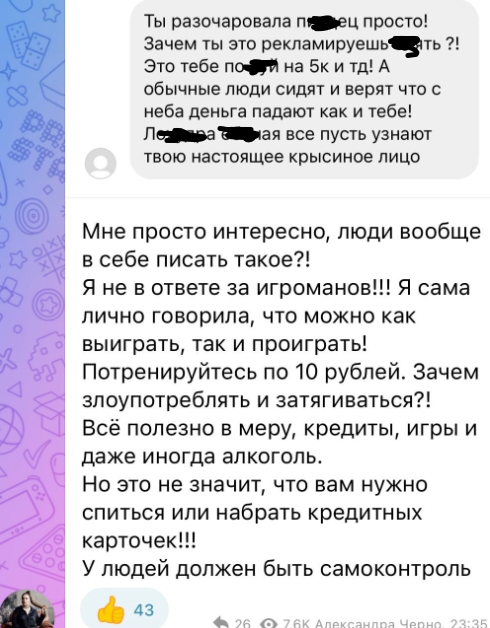 Приложение, которое рекламирует Черно, находится в свободном доступе, и Александра уверяет, что ничего плохого не сделала, люди, которые пострадали финансово, имеют проблемы с самоконтролем. У Черно, по её словам, таких проблем не имеется, и она просто предложила подписчикам популярное в сети развлечение.
