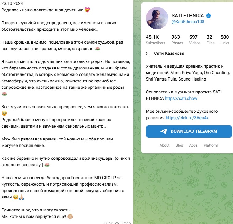 Как призналась сама Сати Казанова, она всегда мечтала о "лотосовых" родах, поэтому когда выпала такая возможность - отказаться от них не смогла. Как утверждает певица, домашние роды принесли ей немало удовольствия - она счастлива была насладиться моментом, который они с мужем запомнят на всю жизнь. "Наша крошка, видимо, поцелована этой самой судьбой, раз все случилось так красиво, мягко, сакрально 🪷", - написала на своей странице Казанова.
