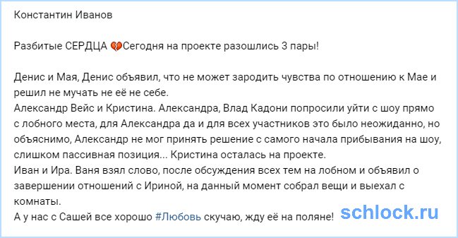 Денис и Мая, Денис объявил, что не может зародить чувства по отношению к Мае и решил не мучать не её не себе. Александр Вейс и Кристина. Александра, Влад Кадони попросили уйти с шоу прямо с лобного места...