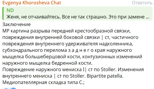 Сергею Хорошеву понадобится полгода на реабилитацию после порванных связок. Это приблизительное время, потому что ещё не было операции и Хорошевы не озвучивают дату.