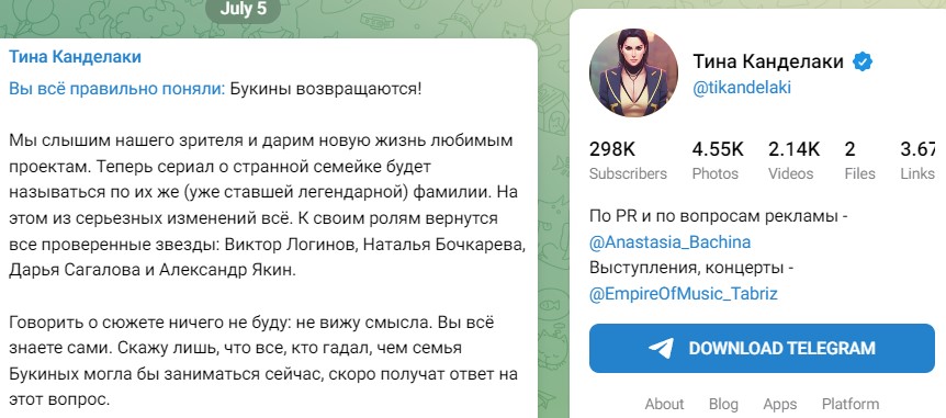 Управляющий директор "Газпром-медиа Развлекательное телевидение" Тина Канделаки также подтвердила начало съёмок полюбившегося многим сериала. "Вы всё правильно поняли: Букины возвращаются! Мы слышим нашего зрителя и дарим новую жизнь любимым проектам. Теперь сериал о странной семейке будет называться по их же (уже ставшей легендарной) фамилии. На этом из серьезных изменений всё., - написала она на своей странице в социальных сетях, - Говорить о сюжете ничего не буду: не вижу смысла. Вы всё знаете сами. Скажу лишь, что все, кто гадал, чем семья Букиных могла бы заниматься сейчас, скоро получат ответ на этот вопрос."