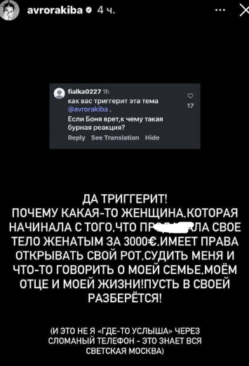 «Она всю жизнь была чьей-то любовницей, а не журналистом» - сообщила Аврора Киба своим подписчикам, добавив, что для работы в журналистике недостаточно курсов "Останкино", нужно учиться в ВУЗе, как Ксения Собчак. Надо же, а некоторым ведущим Дома 2 для работы на телевидении вполне и курсов хватает?