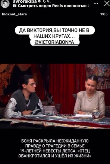 На шоу "Злые языки", комментируя события из мира шоу-бизнеса, экс-участница телепроекта Дом 2 Виктория Боня раскрыла шокирующие подробности из жизни семьи Авроры Кибы - 19-летней невесты популярного российского исполнителя Григория Лепса. Виктория сообщила, что отец Авроры Кибы скончался после банкротства, а мать якобы оказалась в тяжёлом положении, с долгами на сумму 25 миллионов рублей. Потому дочь и решили выдать замуж за Лепса - друга семьи.