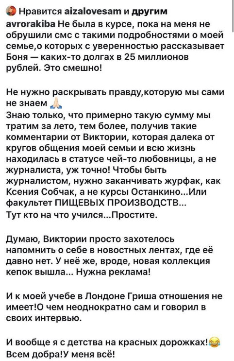 Виктория Боня намекнула, что благодаря Лепсу Аврора смогла учиться в Лондоне, а Аврора отметила в личном блоге, что это неправда, в её круги Боня не вхожа и ничего не знает о доходах чужой семьи.