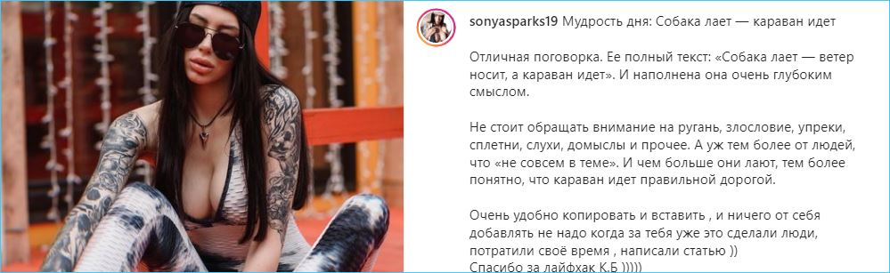 Новый провокатор телестройки Соня Спаркс вступила в полемику с Бородиной, считая, что та, раз уж работает с «легкодоступными девицами», которых не знает даже по именам, тем самым создает участницам рекламу в социальных сетях.