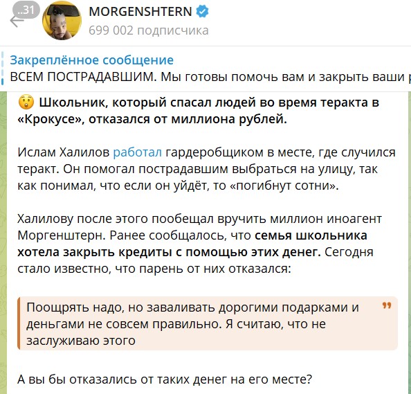 Как стало известно благодаря изданию СтарХит, Алишер Моргенштерн, внесённый в реестр иностранных агентов, не смог остаться в стороне от произошедшего в концертном зале "Крокус Сити Холл". За время своей "гуманитарной миссии" рэперу удалось помочь большому количеству пострадавших от рук террористов. Среди них есть и школьник Ислам - его семье удалось закрыть все кредиты.