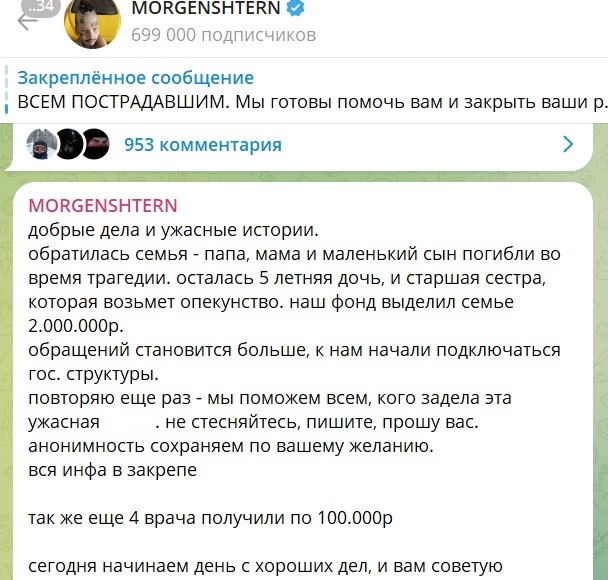 Как сообщает вышеуказанное издание, за неделю открытого сбора - Моргенштерну удалось собрать около 15 миллионов рублей, большая часть из которых уже ушла в помощь пострадавшим и их семьям - 12,5 миллиона. Рэпер не планирует останавливаться на достигнутом - некоторые из семей, пострадавших в ходе теракта, стеснялись обращаться за помощью, но благодаря его поддержке - получили то, чего боялись попросить.