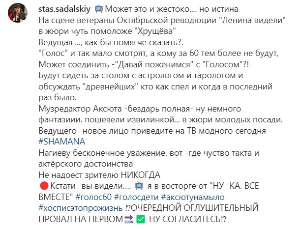 Стоит заметить, Садальский не мог пройти мимо и членов жюри, на места которых нужно было посадить кого-то помоложе. "Может это и жестоко.... но истина. На сцене ветераны Октябрьской реводюции "Ленина видели" в жюри чуть помоложе "Хрущёва"(орфография и пунктуация автора сохранены)", - добавил он, предложив взять в ведущие Ярослава Дронова, известного по псевдониму Shaman.