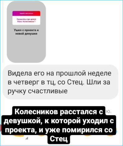 Максим Колесников после ухода с телепроекта Дом 2 сразу же расстался с девушкой, вместе с которой вышел за ворота. Теперь в социальных сетях он и Анастасия Стецевьят интригуют причиной своего развода и возможным примирением.