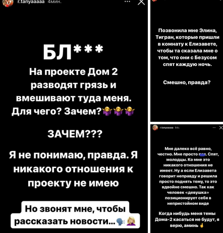 Казалось бы, Репина уже всё сказала и начала повторяться. Ранее мы писали на шлоке, что у Тани был роман с парнем, ухаживания которого она отвергла. Все попытки Безуса помириться Репина также обнулила. Но впереди маячит тема возможной женитьбы Безуса на Субботиной, ведь у них может появиться ребёнок после ночных свиданий. И как к этому отнесётся Татьяна?