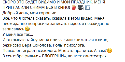Светлана получила роль в фильме "Блогерши", она теперь актриса и амплуа ей подобрали удачное. Поздравляем!