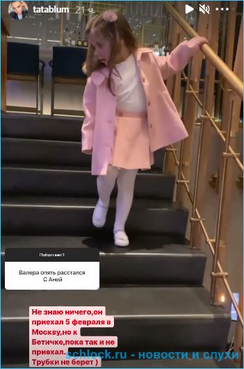 Тата Блюменкранц прокомментировала расставание Валеры с Анной Левченко. Она ничего не знает, но 5 февраля Блюм приехал в Москву, должен был встретиться с малышкой Бетти, но до сих пор никаких вестей от него нет и на звонки бывший муж не отвечает.