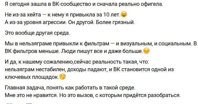 Лицом к лицу, как говорится. Со своими обидчиками Татьяна будет разбираться и понимает, что та социальная группа, которая находится на платформе ВК, несколько иная, чем она привыкла, корректности меньше, как и поддержки. Придётся блокировать недоброжелателей?