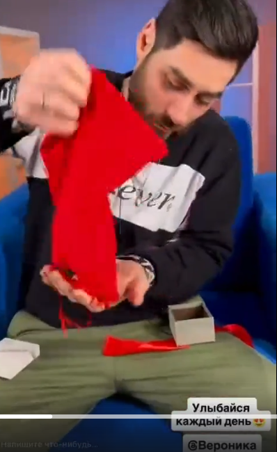 Салибеков сделал сценку про то, как Вероника получает коробочку от Гавришова, долго изучает мешочек и достаёт из него записку, в которой написано, что Гавришову нужно больше подписчиков и хайпа. На самом деле, Гавришов подарил Веронике цепочку.