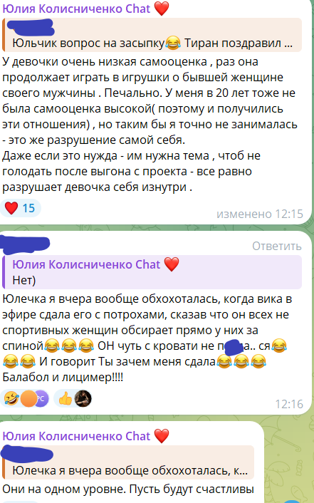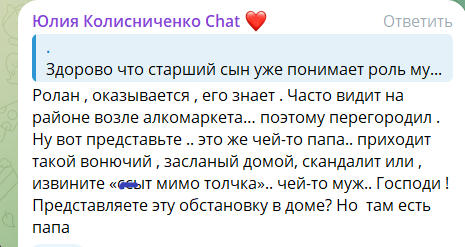 Также Салибекова-Колисниченко, отмечая, какие дружные у неё растут сыновья, поделилась с подписчицами своей гордостью - старший сын Ролан защищает её от обидчиков и на одного нетрезвого мужчину пошел с кулаками, когда тот сказал проходившей мимо Юлии, что она слушает в колонке неправильную музыку.