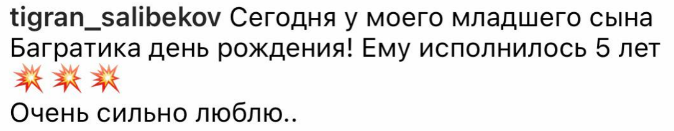 Младшему сыну многодетных Салибековых из Дома 2 исполнилось 5 лет и Тигран Салибеков поздравил Баграта с 5-летием, опубликовав пост в социальных сетях. Участника Дома 2 моментально раскритиковали телезрители, уверенные, что он должен был хотя бы с курьером передать подарок малышу или перевести на подарок и праздник деньги бывшей супруге.