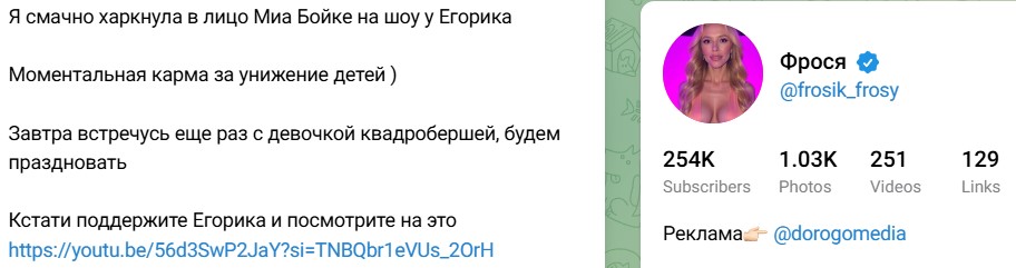 Как утверждает треш-блогер, план отомстить Миа Бойке созрел сразу же после концерта певицы, в ходе которого на сцену поднялась девочка-квадробер в костюме кошки. По словам Фроси, Миа унизила не только девочку, но и всех людей, увлекающихся этим необычным "видом спорта". "Ей прилетела карма за то, что она унизила ребенка при всех. Я всегда плюю людям в лицо, если они мне не нравятся. Мы с командой вынашивали этот план с момента, как она накинулась на девочку, и ее мама эту идею поддержала и была очень рада", - приводит её объяснения издание Рамблер.Новости.