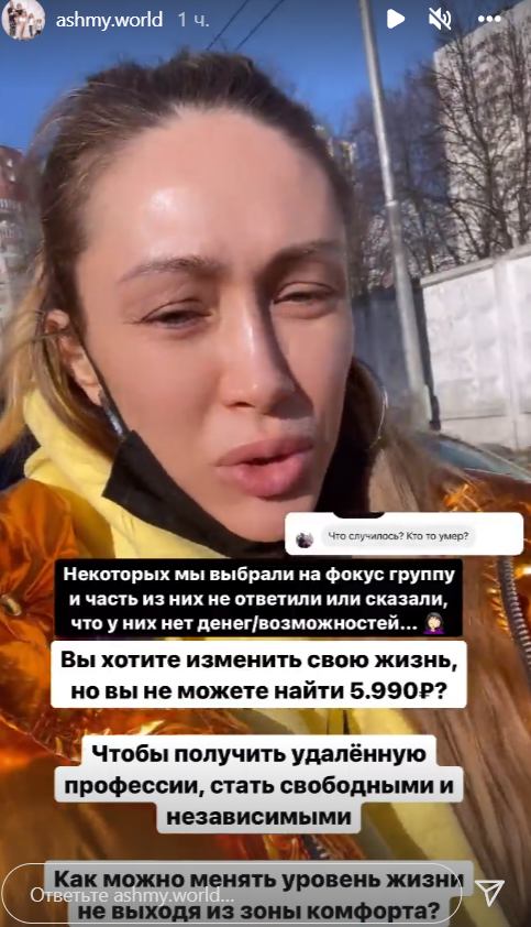Бывшая участница Дома 2 сначала выставляет на своей странице в Инстаграм свечу, намекая на трагедию в её жизни, а затем пишет о наболевшем и в этот раз её хайп перешел всякие границы. Поклонники Алёны подумали, что у неё опять что-то случилось в семье, а оказалось, что у Ашмариной траур по другому поводу - подписчики не покупают её марафоны. Ашмарина уже устала объяснять поклонницам, что заплатив 6 тыс. руб. за услуги интернет-консультантов, которых она продвигает, они получат престижную и современную профессию. Но доверчивых фанатов всё меньше и меньше.