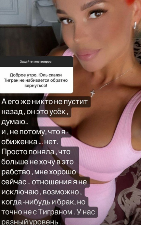 Юлия Колисниченко подчеркнула, что не примет назад Тиграна Салибекова, потому что у них разный уровень. Она допускает, что снова выйдет замуж, но не вернется к прежнему формату отношений.