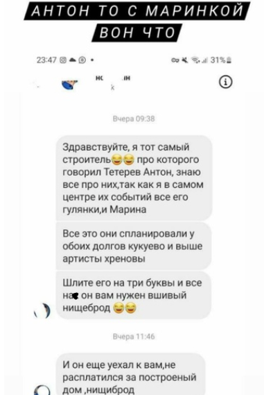 У Тетерева огромные долги - утверждает Наталья Безверхова, показывая своим подписчикам переписку со строителем- поклонником Дома 2, которому Антон Тетерев не заплатил за работу.