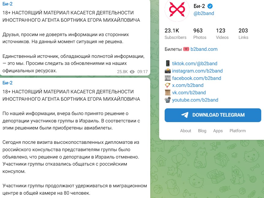 Как стало известно из телеграм-канала группы "Би-2", в настоящее время решение о депортации её участников в Израиль было отменено, но они всё также продолжают быть удержанными в камере на 80 человек. Общаться с представителями российского консульства Таиланда музыканты отказались, но положительный исход от их прихода они уже прочувствовать успели. "Сегодня после визита высокопоставленных дипломатов из российского консульства представителям группы было объявлено, что решение о депортации в Израиль отменено. Участники группы отказались общаться с российским консулом. Участники группы продолжают удерживаться в миграционном центре в общей камере на 80 человек(орфография и пунктуация автора сейчас и далее сохранены)", - сообщает указанный телеграм-канал.