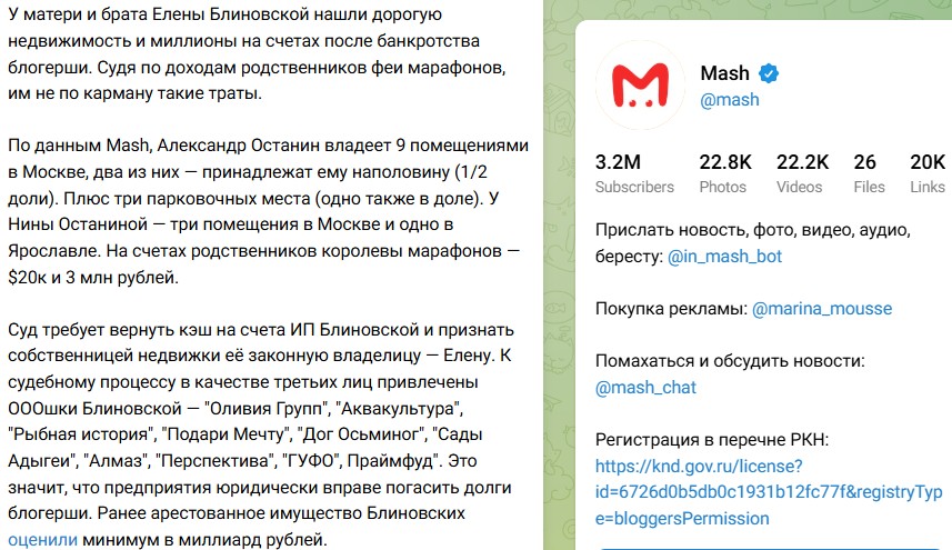 По информации телеграм-канала Mash, деньги на счетах мамы и брата Елены Блиновской - по всей вероятности принадлежат ей самой. Также в собственности родственников Елены имеется ряд помещений, на покупку которых им бы просто не хватило средств. По данным СМИ, суд требует вернуть эти средства на счета настоящей владелицы, чтобы их можно было удержать в пользу государства.